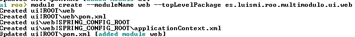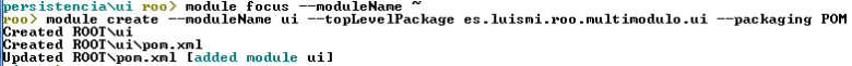 Roo> module create –moduleName ui –topLevelPackage es.luismi.roo.multimodulo.ui –packaging POM