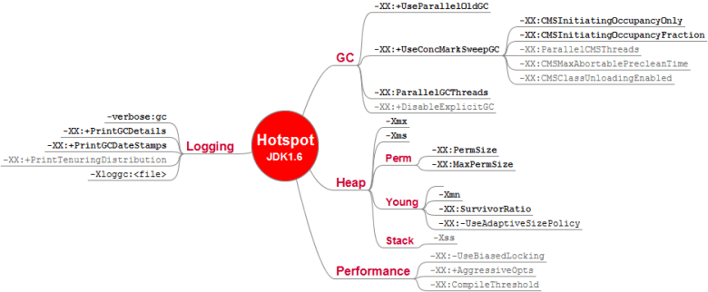 En el diagrama se pueden ver los parámetros de la JVM que permiten tunear nuestras aplicaciones Java (los que aparecen en gris son los opcionales, antes de probarlos es recomendable haber jugado con todos los demás):