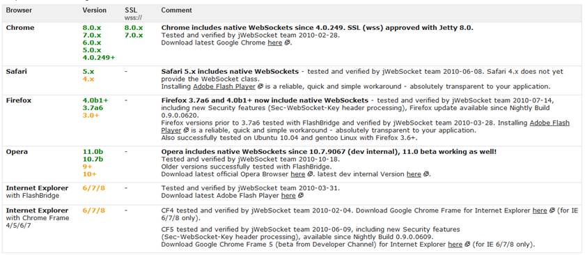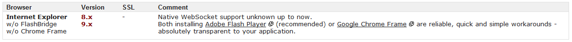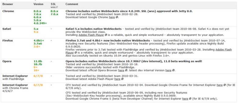 Lo más interesante que ofrce es el jWebSocket FlashBridge, que es un wrapper Flash que permite usar WebSockets en cualquier navegador que soporte y tenga instalado Flash. Esto nos permite usar WebSockets hasta en IE 6.