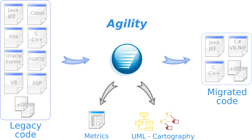 Obeo Agility es un producto capaz de convertir código legacy a código migrado sobre diversos lenguajes: