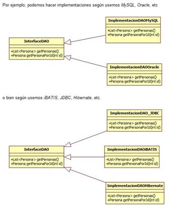 · Su objetivo es independizar de la fuente de datos a la aplicación ocultando los detalles de implementación haciendo que el interfaz no cambie aunque cambie la forma de resolverlos (llegado al extremo podríamos cambiar de una base de datos relacional a una base de datos NoSQL o a la persistencia en ficheros y el resto de la aplicación no se enteraría).