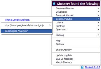 Ghostery es un plugin para Firefox, Chrome, Opera, Internet Explorer y Safari que permite bloquear el seguimiento que hacen algunas páginas Web.