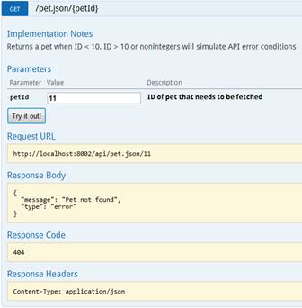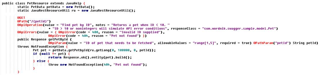 Si revisamos el código de la clase PetResource veo que Swagger ofrece anotaciones para documentar las operaciones (@ApiOperation), los errores (@ApiError) y los parámetros (@ApiParam)