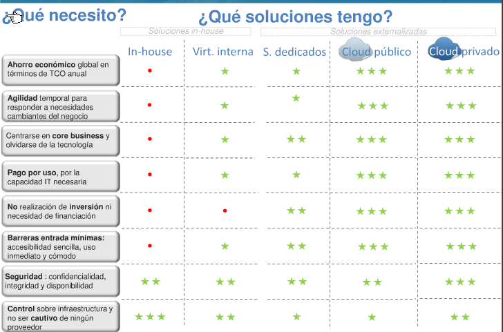 En esta interesante slide se valoran diferentes criterios a tener en cuenta para la elección de ir a una Cloud y qué tipo elegir: