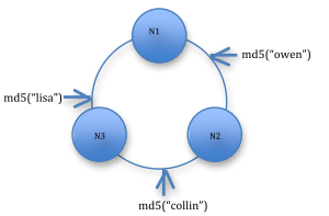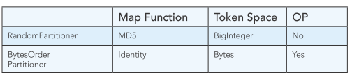 Con RandomPartitioner, las claves se distribuyen uniformemente a través del anillo utilizando hashes, pero se sacrifica el orden, lo que significa que cualquier consulta amplia debe consultar todos los nodos en el anillo.