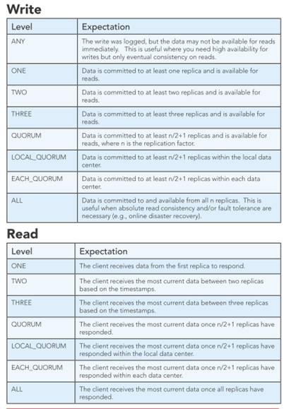 Los clientes pueden especificar el nivel de consistencia en la lectura y escritura balanceando entre la alta disponibilidad, consistencia y el rendimiento.