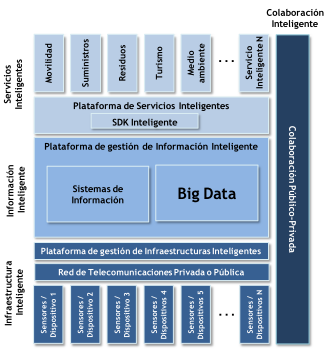 El potencial de Big Data en la implantación de Smart Cities, reside en el gran volumen de información proveniente de los dispositivos distribuidos en la ciudad, que continuamente están proporcionando datos en distintos formatos y por diferentes canales, al tiempo que son accedidos, compartidos o modificados por usuarios u otras aplicaciones. Así mismo, Big Data facilita una gestión homogénea de la información independientemente del tipo de servicio y/o valor y de su ubicuidad, ya sea en concentrada en CPDs o bien distribuida en cloud computing.