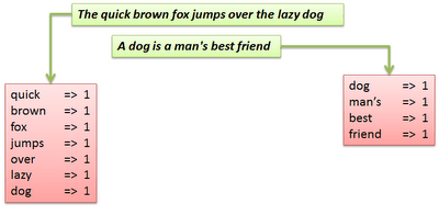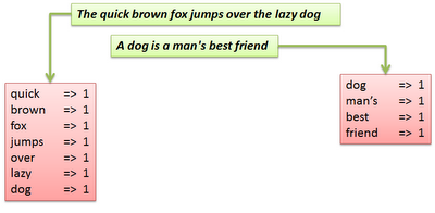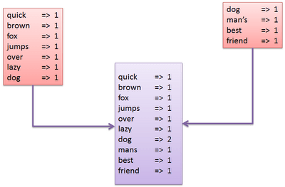 Cuando hubiésemos contado las palabras de cada parte tendríamos que combinarlos mapas de las dos sentencias en un Mapa único (Reduce):