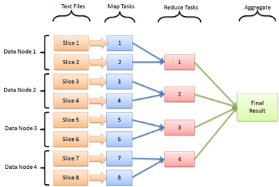 Si ahora imaginamos que cada parte del texto la tenemos almacenada en bloques HDFS y mapeamos las tareas en cada uno de los nodos entonces podremos usar el poder de computación de cada nodo: