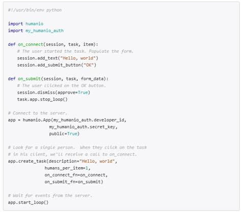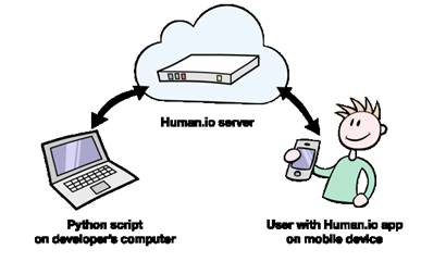Human.io ofrece un API que permite crear pequeñas aplicaciones Python con un poco de código, subir la aplicación a human.io y que los usuarios la colaboren con las tareas que hemos diseñado. Human.io da acceso al GPS y a la cámara.