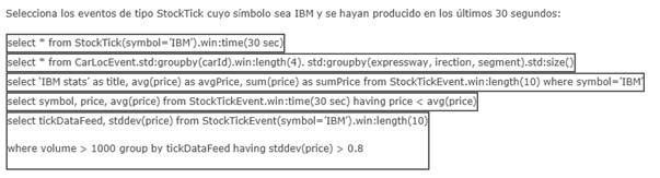 - La definición de patrones se realiza mediante el lenguaje EPL (Event Processing Language) es un lenguaje estilo SQL con sintaxis SELECT, FROM, WHERE, GROUP, ORDER, enfocado a realizar consultas sobre los eventos de un CEP.