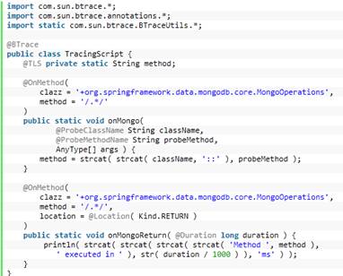 Las ventajas de usar BTrace frente a usar por ejemplo AspectJ es que me permite crear y cargar scripts mientras el código Java está ejecutando.