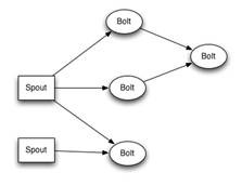 Un conjunto de Spouts y Bolts se organizan en una topología DAG (Directed Acyclic Graph). En Hadoop un flujo de trabajo se traduce a menudo en un conjunto secuencial de Maps y Reduce jobs.
