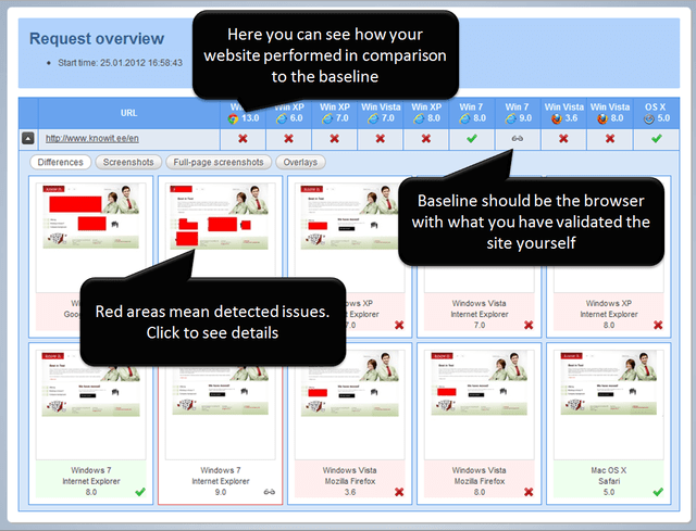 Y nos dejará ver cuál es el resultado de la URL en los diferentes navegadores y versiones marcando en rojo las diferencias: