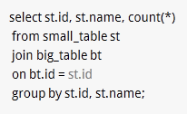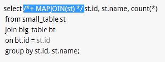 Cuando tenemos que hacer una join en el que una de las tablas es pequeña podemos usar el MAPJOIN que básicamente lo que hace es almacenar en la caché distribuida la tabla sobre la que se hace el MAPJOIN, para hacerlo basta con incluir el MAPJOIN de la tabla a cachear:
