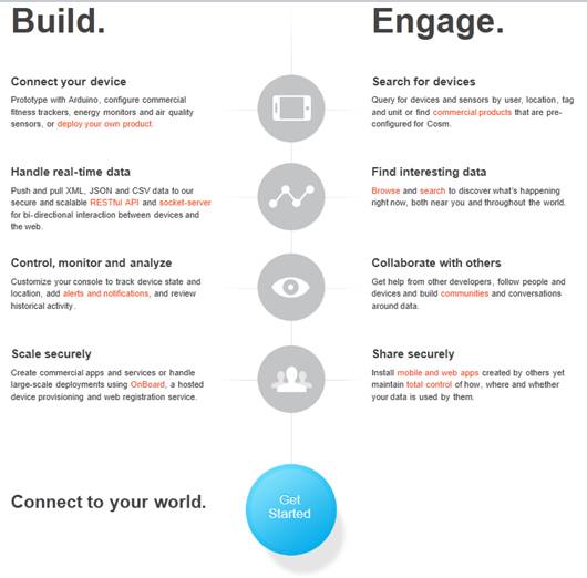 · Plataforma escalable y segura que permite conectar dispositivos y soluciones con aplicaciones permitiendo control en tiempo real y almacenamiento. La plataforma corre en los datacenters de LogMeIn (que compró Pachube en julio de 2011).
