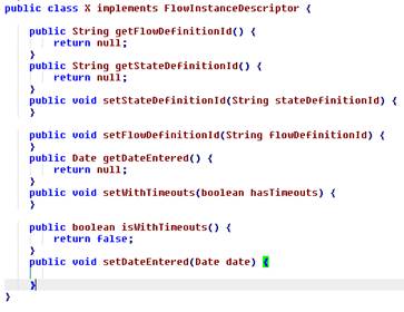 La clase X implementa FlowInstanceDescriptor y define una serie de métodos: