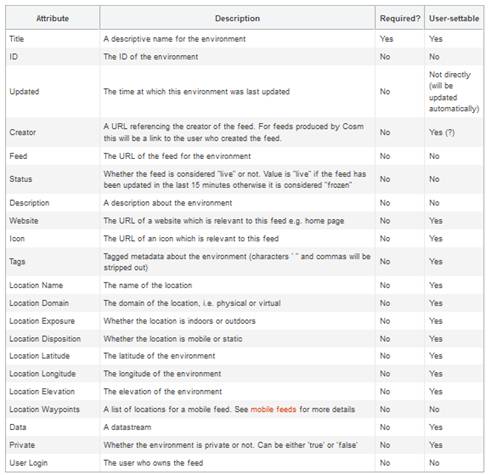 Un Feed es un entorno que representa un grupo de datastreams con un conjunto de atributos (algunos obligatorios, otros opcionales):