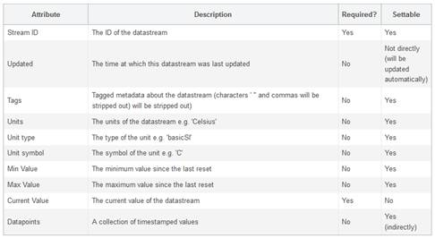 Un datastream representa el stream de un sensor/dispositivo dentro de un entorno y contiene los siguientes atributos (algunos obligatorios, otros opcionales):