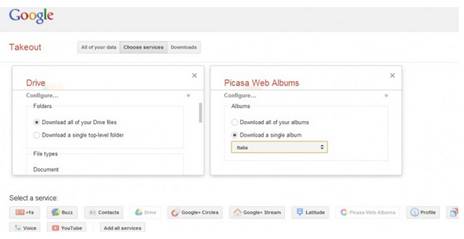 Ha pasado casi un año y medio desde que Google lanzó Google Takeout, un interesante servicio que permite realizar una copia de seguridad para descargarlos y conservarlos. El servicio está en expansión y, poco a poco, Google va añadiendo más servicios de los que descargar datos (Youtube, Picasa, etc). Siguiendo esta línea, Google le ha añadido a Takeout soporte para Google Drive y ha mejorado la descarga de archivos en Picasa.