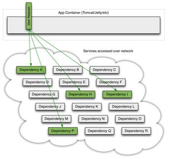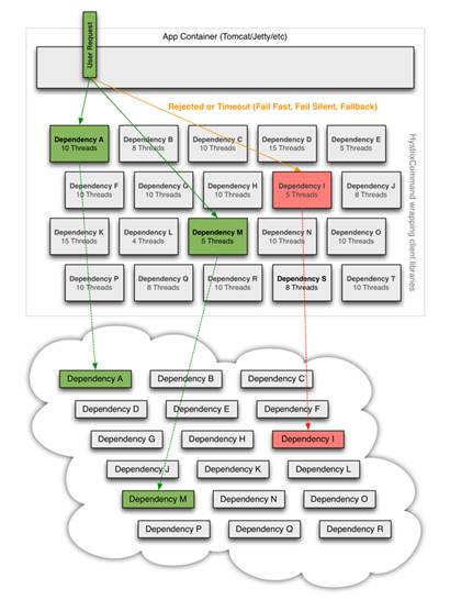 Cuando se usa Hystrix para envolver cada dependencia subyacente la arquitectura se comporta así: