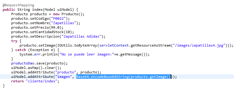 Introduzco en el Model que va a la JSP un atributo llamado imagen con la imagen del Producto codificada en Base64.