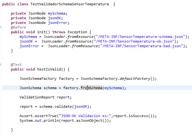 4) En mi proyecto Java importo dependencia de json-schema-validator y creo un Test para verificar que JSON es correcto: