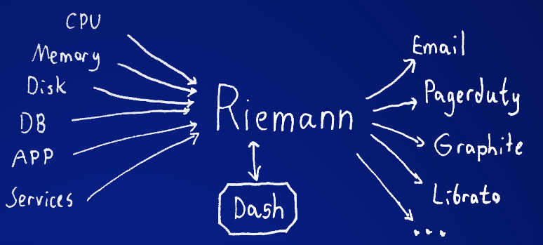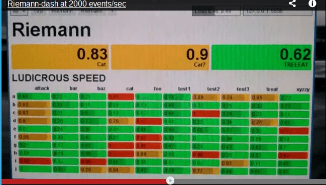 Riemann es una solución que permite monitorizar sistemas distribuidos, para eso permite lanzar eventos desde servidores, aplicaciones,consumo SPU,… y procesarlos en Riemann con su lenguaje de procesamiento de streaming para por ejemplo generar alertas, enviar correos, pintars en un BAM,…