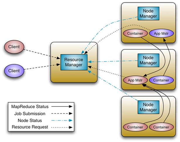 MapReduce ha sido objeto de una revisión completa en Hadoop 0,23 con el cambio fundamental que divide las dos funciones principales del JobTracker: gestión de recursos y planificación de tareas / monitoreo, en 2 demonios por separado.