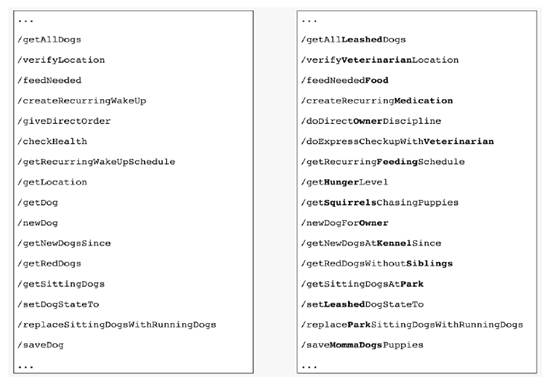 · Algunas APIS Web usan una aproximación method-driven para el diseño de las URLs, estas suelen contener verbos, a veces al principio a veces al final lo que siempre lleva a una larga lista de URLS no consistentes: