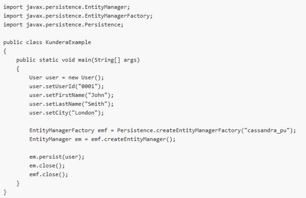 Kundera es una librería que surge para simplificar el trabajo con bases de datos NoSQL, de modo que trabajar con NoSQL sea tan simple como con SQL y además sea una solución JPA compliant para datastores NoSQL.
