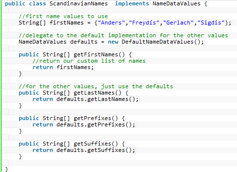 Muy interesante es como soporta que se amplíe la generación de tipos de datos, por ejemplo como generar nombres escandinavos: