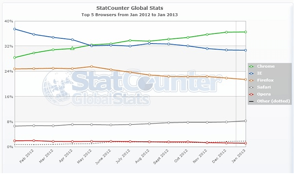 Hoy en día, Google Chrome es la referencia a nivel de navegación. Durante el mes de enero consiguió una cuota de mercado del 36,52%, frente a la cuota del 36,42% que se contabilizó en el mes de diciembre del año pasado.