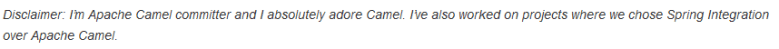 También un apunte personal, algunos de los puntos comparados podrían rebatirse o complementarse, es normal que Spring Integration tenga menos líneas de código, ya que por un lado se basa en Spring y por otro no ofrece tantas funcionalidades como Camel (DSLs por ejemplo), esto serviría para rebatir los puntos 2 y 3.
