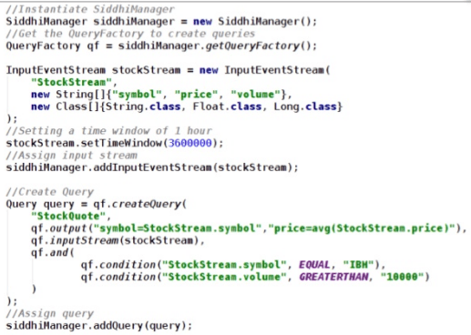 Siddhi ofrece un API Java que permite crear queries de esta forma: