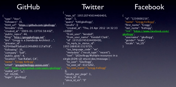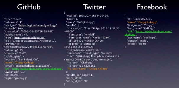 Con JSON-LD se puede evitar que cada API que usa JSON devuelva para referirse a los mismos conceptos estructuras diferentes: