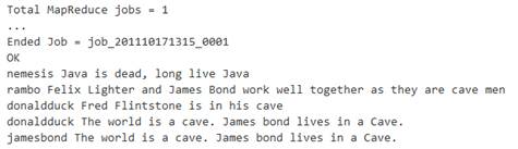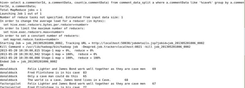 Hive>select a.commenterId, a.commentData, count(a.commentData) from comment_data_split a where a.commentData like ‘%cave%’ group by a.commenterId, a.commentData;