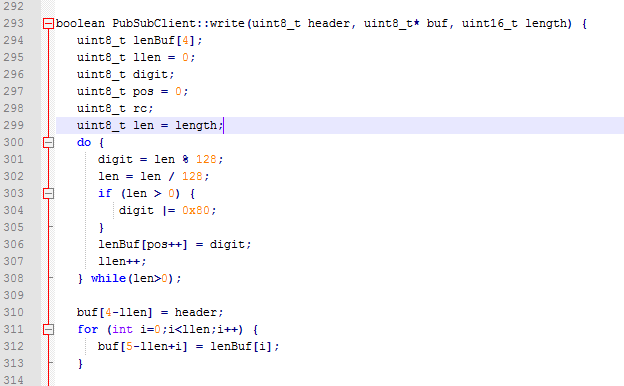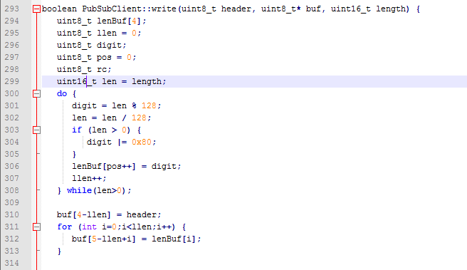 Si nos vamos al fichero PubSubClient.cpp, al lugar donde la librería construye la cabecera (función write()), podemos ver que el “Remaining Length” de la cabecera se genera mal con mensajes de tamaño superior a 256 bytes, debido a un desbordamiento por el tipo de datos, ya que para almacenar la longitud utiliza un entero sin signo de 8 bits: