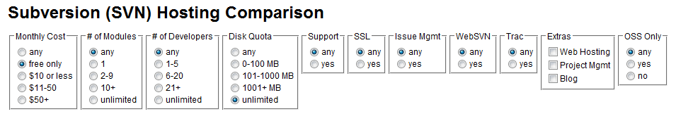 La web te permite filtrar por interesantes criterios, desde el evidente de free only, al tamaño del repositorio, si tu proyecto es OSS, si ofrece Hosting de proyecto,…