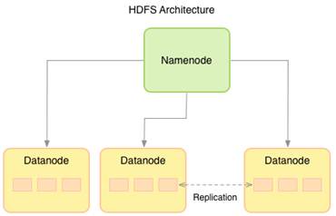 · HDFS usa una arquitectura Master-Slave donde el maestro es el NameNode que se encarga de gestionar los ficheros y los metadatos.