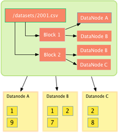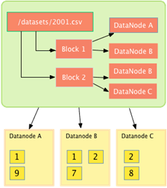 · HDFS almacena los ficheros partiéndolos en bloquees (por defecto de 64 MB). Con esto se consigue minimizar el coste de las búsquedas.