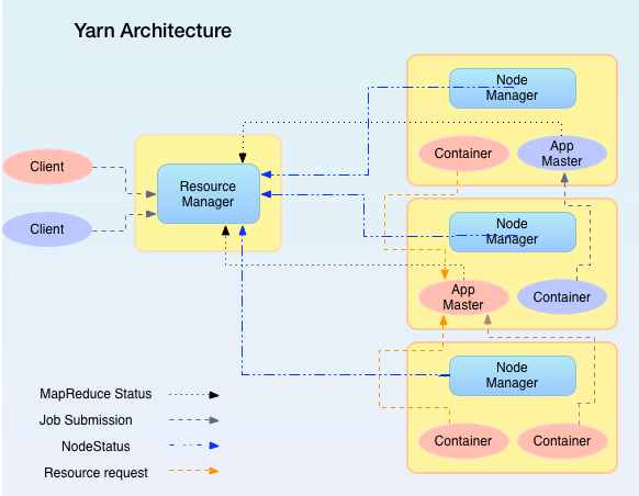 · Resource Manager provee un endpoint a los clientes para hacer la solicitud de trabajos. Tiene ApplicationsManager incorporados que gestionan los trabajos en el cluster.