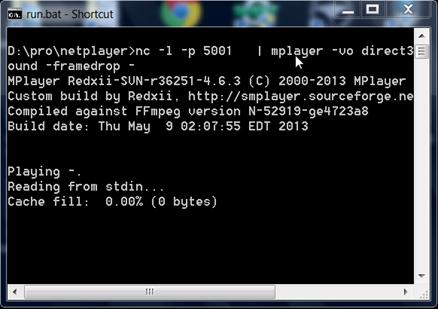 >nc -l -p 5001 | mplayer -vo direct3d -fps 31 -cache 2048 -nosound -framedrop –