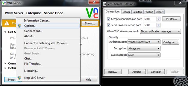 El puerto de escucha por defecto es el 5900, es posible cambiarlo desde la sección options.