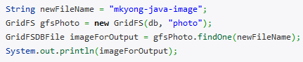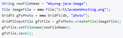 //conexion a BD Mongo Mongo mongo = new Mongo( «xx.xx.xx.xx» ); String dbName = «mydatabase»; DB db = mongo.getDB(dbName ); //Creo GridFS sobre base de datos GridFS fs = new GridFS( db ); //almaceno imagen GridFSInputFile in = fs.createFile( imageBytes ); in.save(); //recupero Id asignado in.getId(); //busco imagen almacenada GridFSDBFile out = fs.findOne( new BasicDBObject( «_id» , in.getId() ) ); |