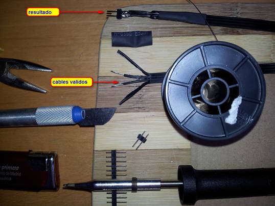 Unos pines, estaño, soldador, tubo termoretractil y procedemos a pelar los dos cables centrales y soldar los pines así: