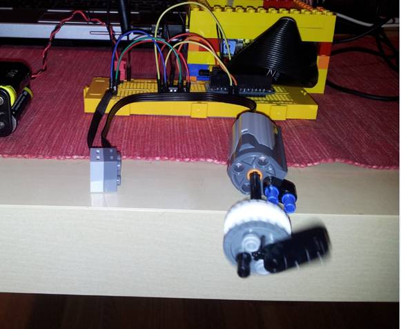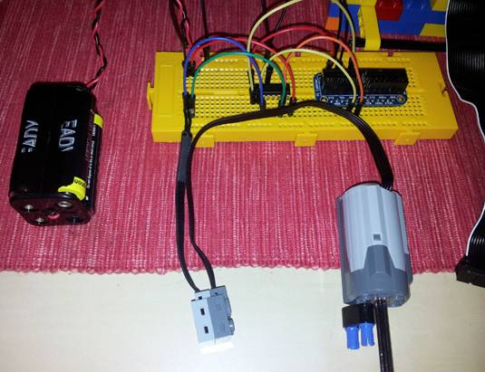 Conviene destacar para esta prueba que el motor de lego acepta 9V y nosotros lo alimentaremos con una batería de 6V, con lo cual no alcanzaremos el máximo potencial.