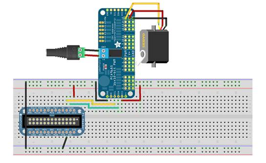Vamos a hacer un ejemplo sencillo. Para hacer la prueba, aparte del pi y el servo driver PCA9685 de adafruit, necesitamos: