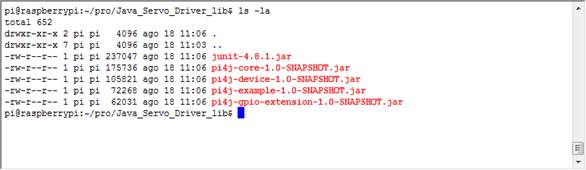 >sudo java –classpath .:classpath:/home/pi/pro/Java_Servo_Driver_lib/’*’:/home/pi/pro/Java_Servo_Driver.jar com.metaclura.i2c.Test_ Java_Servo_Driver