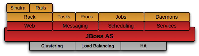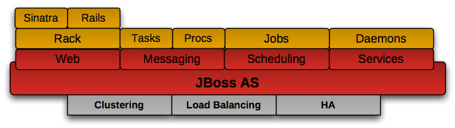 TorqueBox incluye un entorno complete cosntruido sobre JBoss AS y JRuby, lo que le da capacidades de clustering, HA, balanceo de carga out-of-the-box.